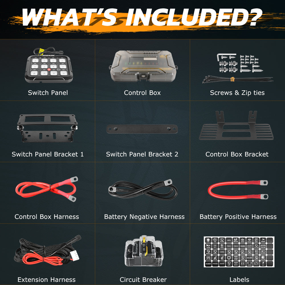 This switch panel power distributon system makes installing aftermarket led lights or electronic car devices or camping devices so much easier! It offers perfect solution to clean up all wiring harness mess through a single panel and compact size circuit control box. This switch panel system allows you to connect and control 12 car auxiliary LED light bars or LED fog driving lights or other electronic devices once a time.