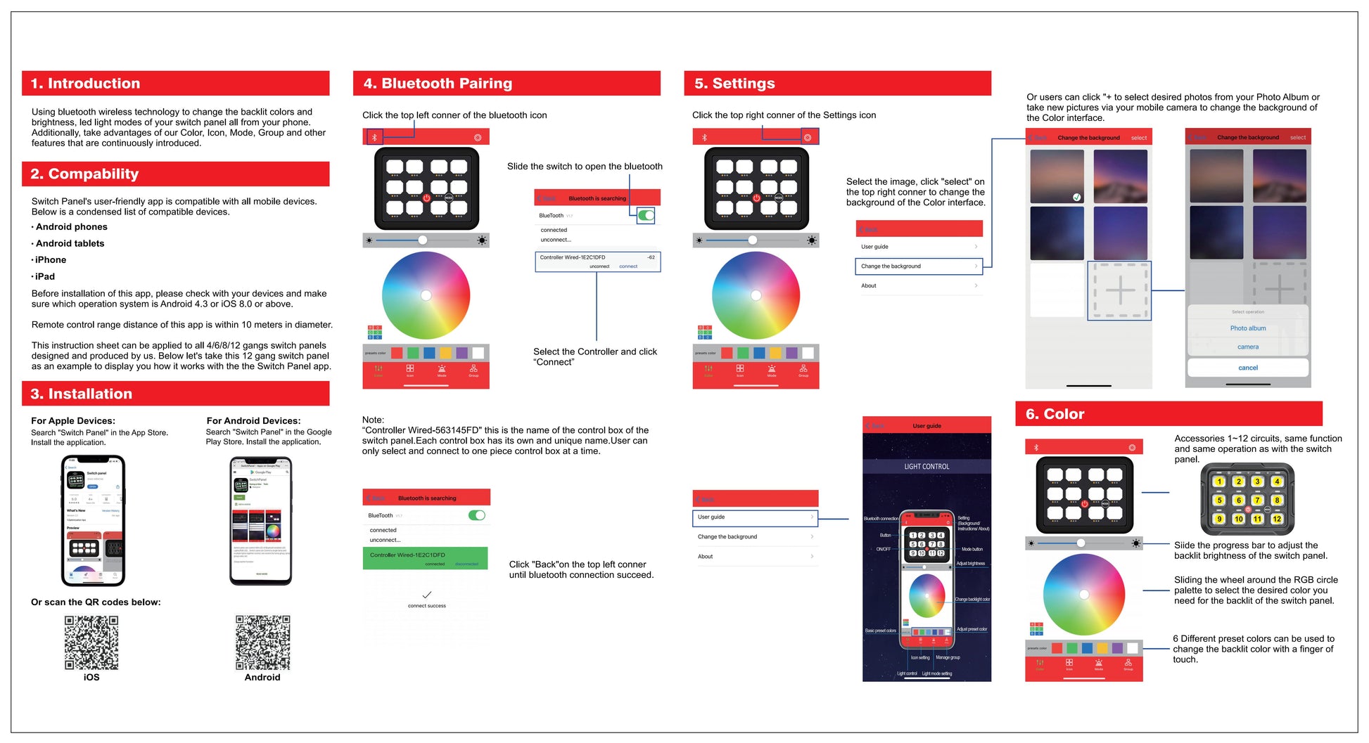 Comparing with those blue or green backlit switch panel control boxes on the current market, the biggest advantages of this switch panel power distribution system is user programmable and control via the panel or smart phone, bluetooth interface. The app name is Switch Panel. User can download it from phone app store directly. For instance, if users connecting 12 led lights to the switch panel, you can turn these lights on or off inside the cab where you mount the switch panel, or you can step outside the vehicle, power all the lights on and off in 10 meters away via a finger touch on your phone app.