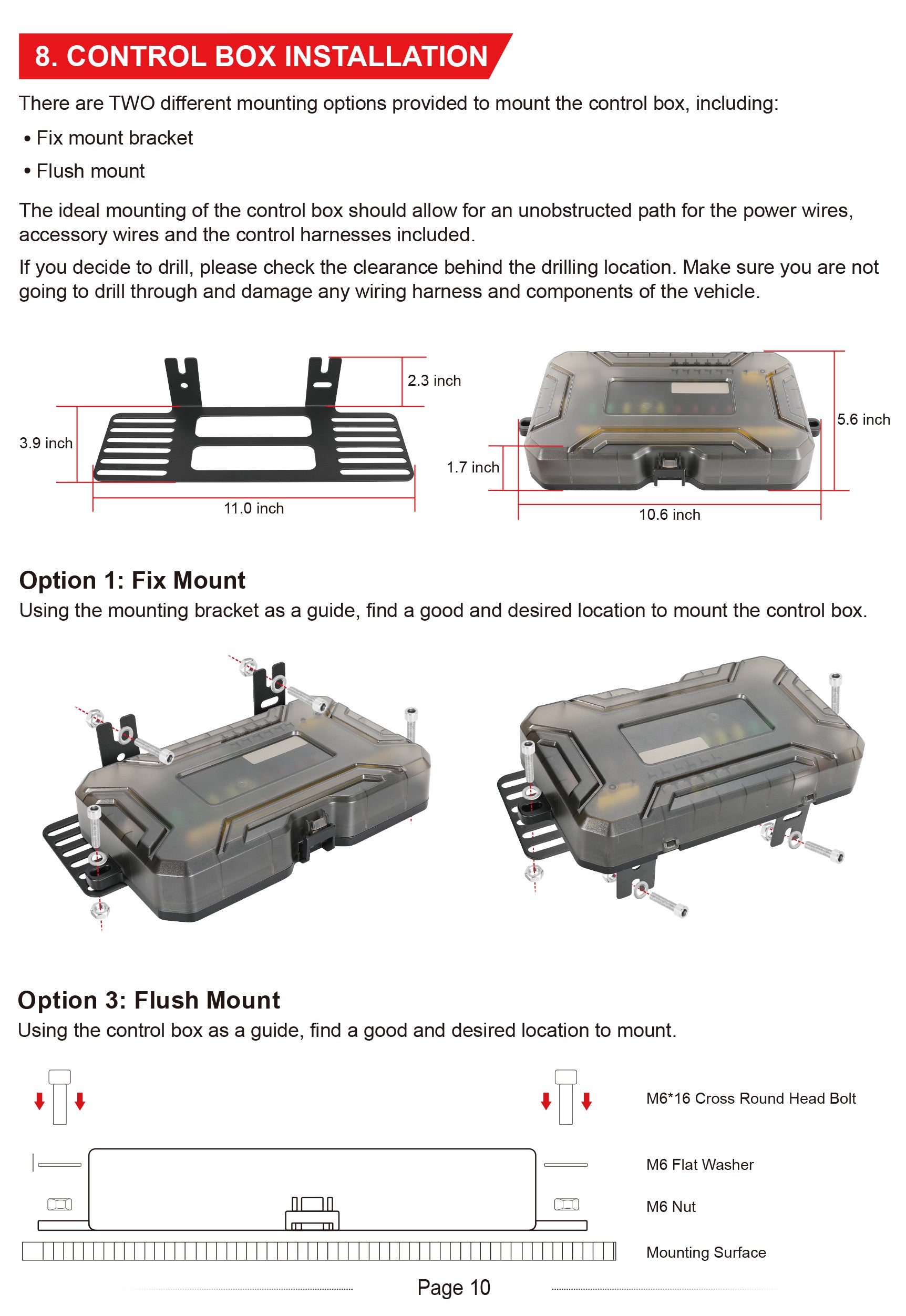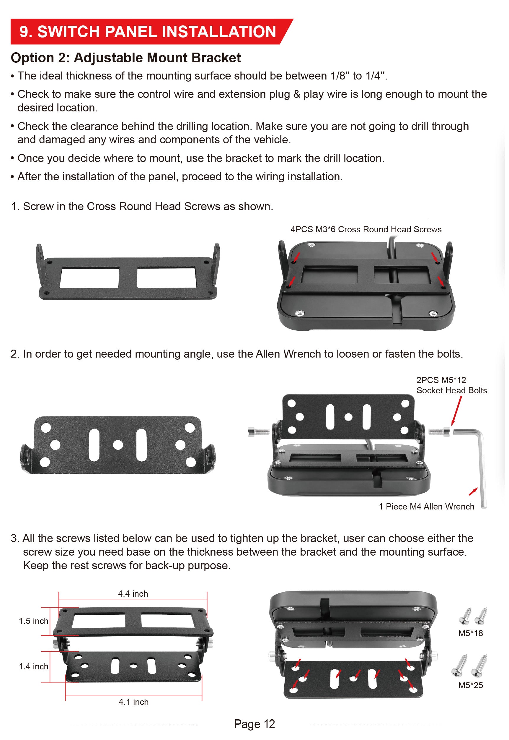 Available with flexible or fix mount brackets. For most of the cases, end users could mount the switch panel overhead the rear view mirror or overhead liner, onto the dashboard arround the steering wheel, embedding or inserting into the position nearby the car audio device, empty postion between the driver and passenger, or even in the car trunk bed, etc.