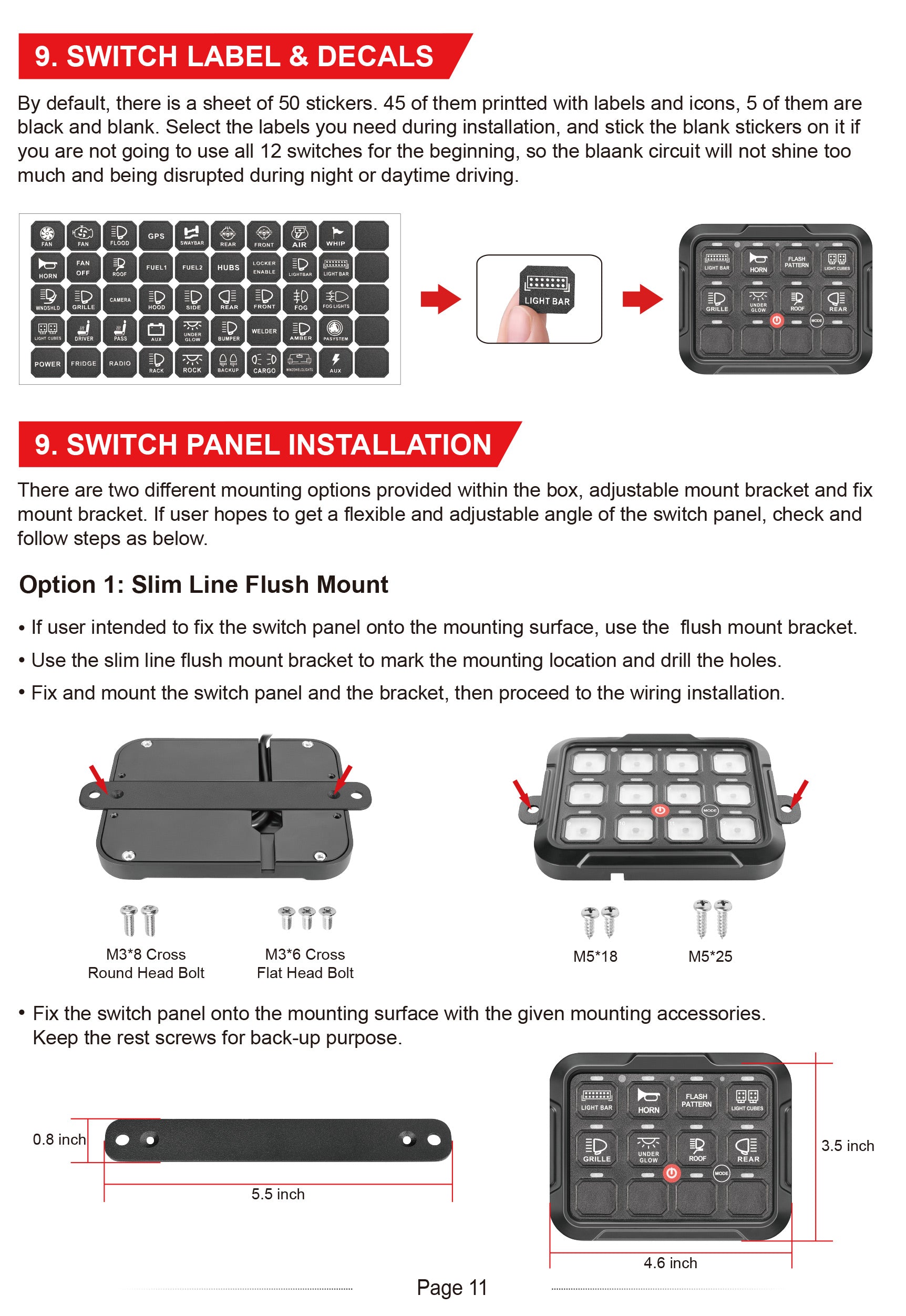 By default, there is a sheet of 50 stickers. 45 of them are printing with labels and icons, 5 of them are black and blank. Users could select the needed legends during installation, and stick the blank stickers on it if you are not going to use all 12 switches for the beginning, so the blank circuit will not shine too much and being distrupted during night or daytime driving.