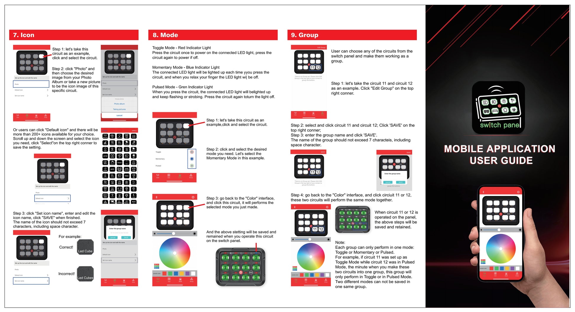Toggle mode helps you to turn on and off the connected led lights, momentary mode mostly used for product such as horn, pulsed mode for strobing flashing needed LED warning lights or emergency lights. While the group function could let you to set groups with same light mode and same operation.